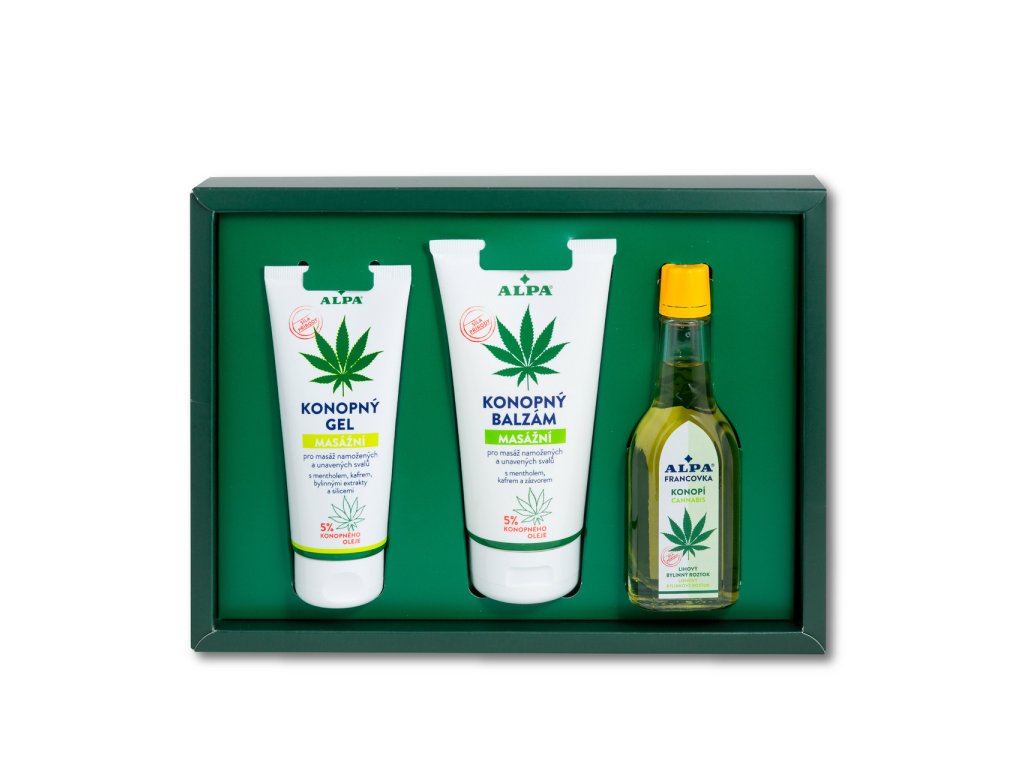 - Obsah: Konopný gel (100 ml), konopný balzám (150 ml), konopná francovka (60 ml)