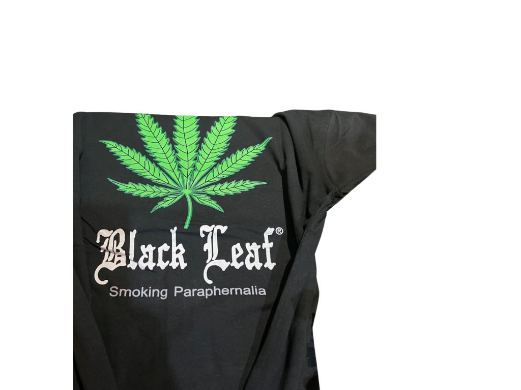Černé tričko s velkým zeleným konopným listem a logem Black Leaf je ideální volbou pro každého fanouška kuřácké kultury a kvalitního designu.