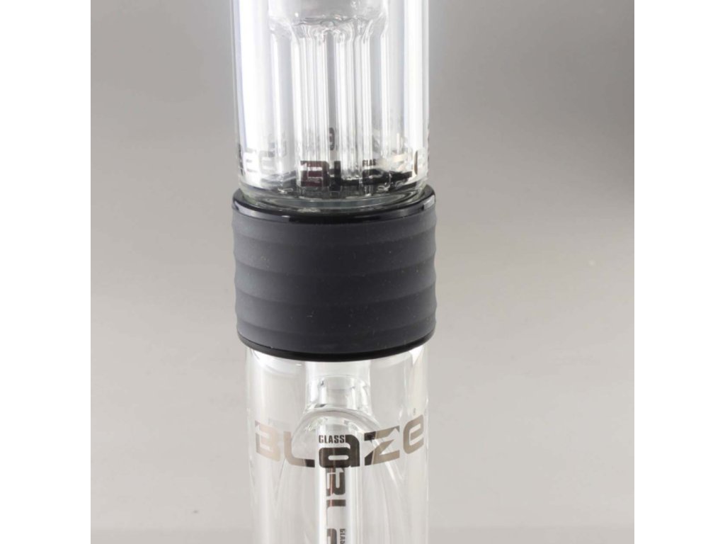 Nejprve položíme spodní část (vodní komoru) na stůl. Poté přišroubujeme šedý silikonový kroužek. Dále do tohoto kroužku vložíme šestiramenný stromový perkolátor s ochranou proti stříkající vodě. Poté do šedého kroužku zašroubujeme spodní stopku. A nakonec do kloubu vložíme štěrbinový difuzér chillum a misku na bylinky do chilluma – a máte ho: špičkový, úžasný BLAZE® bong, který slibuje úžasné potažení.