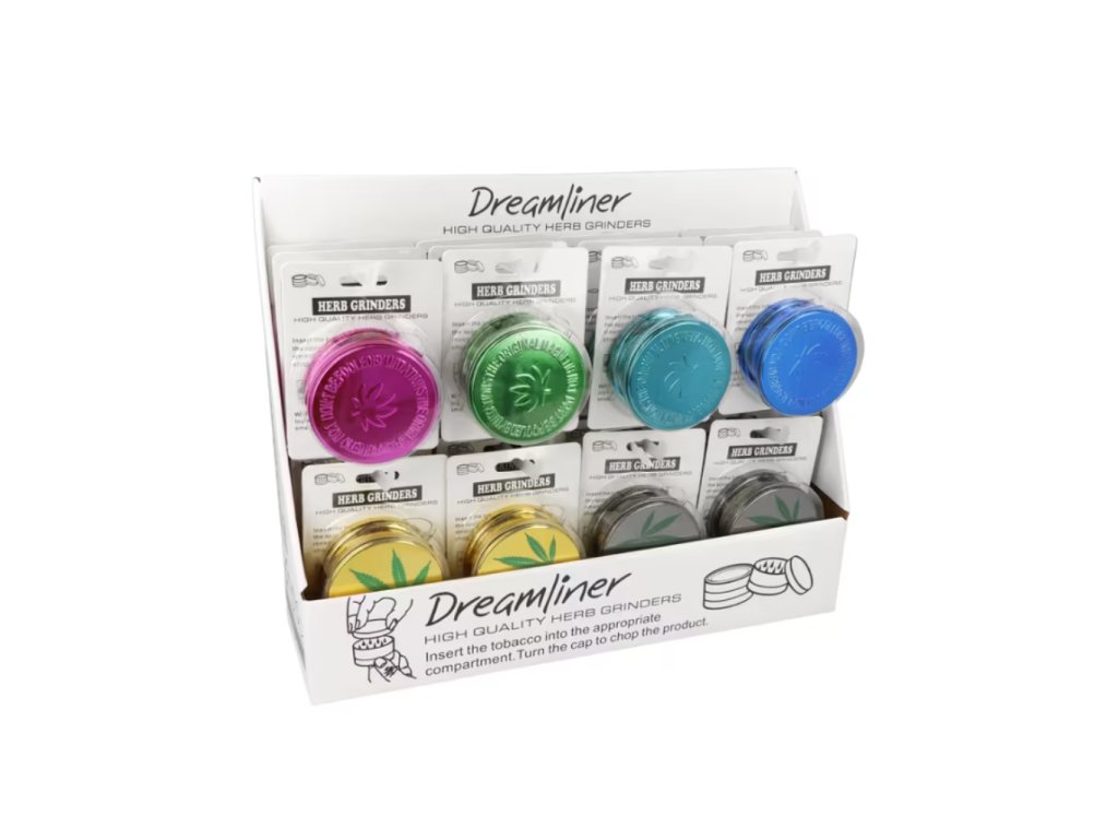 Plastová drtička na konopí, tabák a jiné bylinky. Dvojdílný drtič Dreamliner s povrchem v barevném metalickém provedení je spojený na magnet. Horní strana drtiče je zdobená listem konopí. Ostří ve tvaru diamantu jemně nadrtí směs do požadované hrubosti. Plastový drtič je dodávaný v blistru.