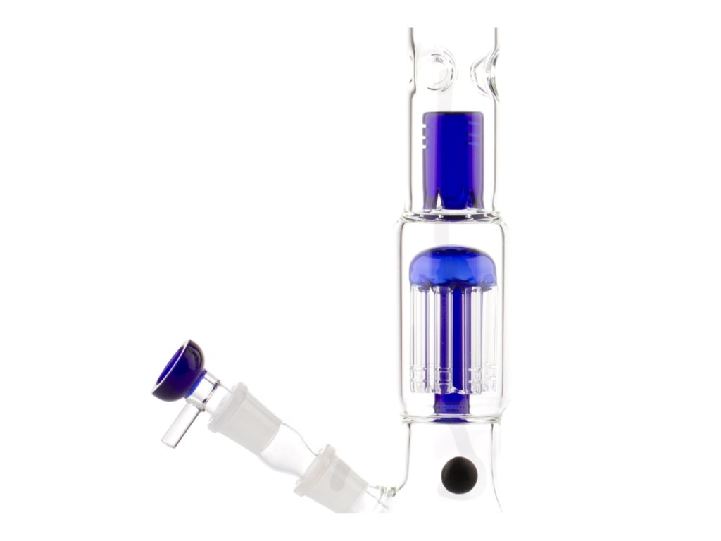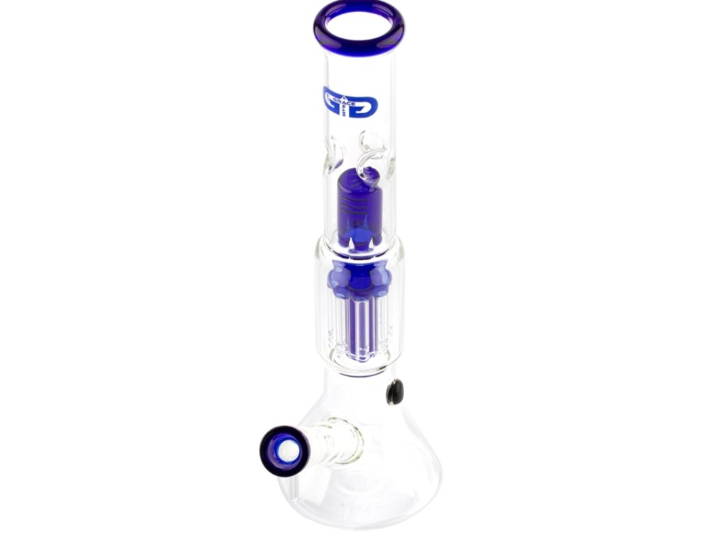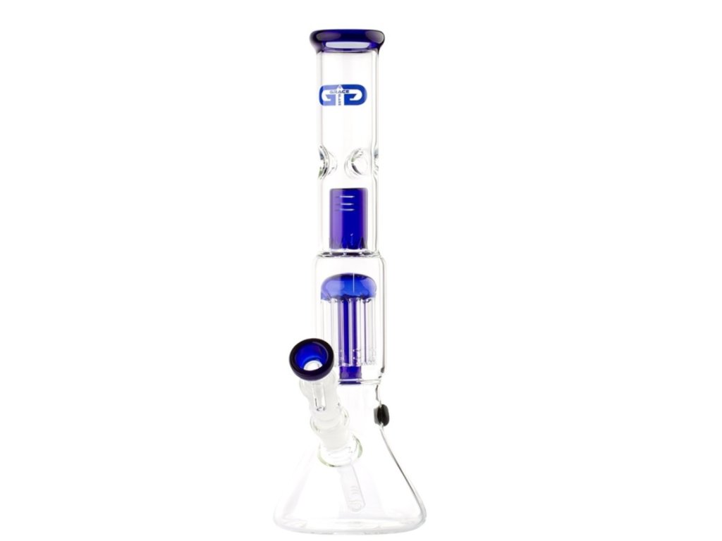 Tento skleněný bong Beaker Grace je vzrušující skleněný kousek, který vám nabídne úžasný zátah! Dodává se s modrými akcenty na robustním tepelně odolném borosilikátovém skle ve tvaru základnové trubice. Vaše vzácné bylinky jsou umístěny na misku s rukojetí pro snadné zvedání. Miska je spojena s chillumem přes pevné dno o průměru 18,8 mm. Kouř vstupuje do trubice přes chillum, kde je filtrován vodou. Modrý perkolátor 1x8 Arm probublává kouř a vyhlazuje potah. Modrá ochrana proti stříkající vodě ve tvaru kopule zabraňuje stříkající vodě do úst. Některé ledové bongy pojmou několik kostek pro ochlazení kouře a otvor s gumovou zátkou vám nabídne možnost vychutnat si jiný úhel potahu. S modrým logem Grace Glass v horní části trubice je celá sestava zasazena do modrého kroužku na náustku.