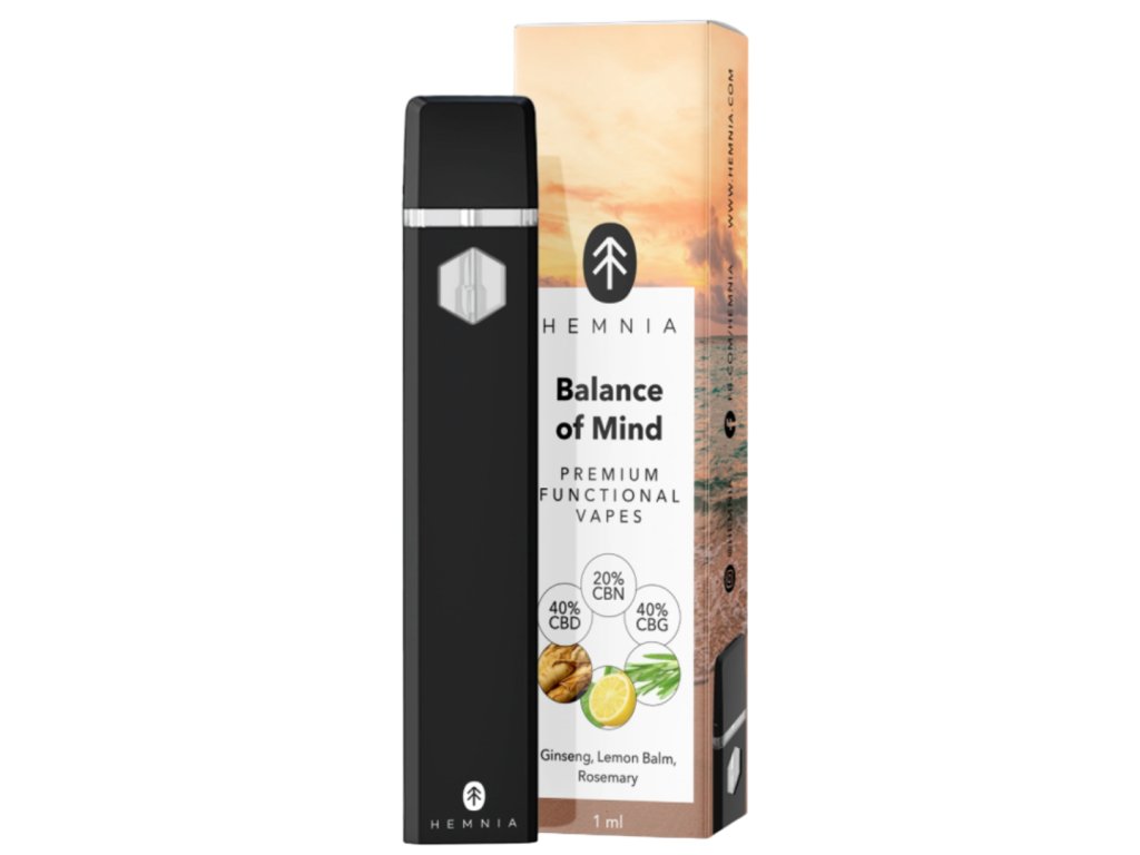 Hemnia Prémiové funkční vaporizační pero Balance of Mind – 40 % CBD. 40 % CBG, 20 % CBN, ženšen, meduňka, rozmarýn, 1 ml