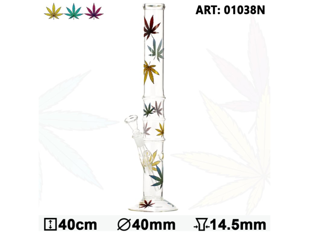 Tento skleněný bong Multi Leaf je jednoduchý skleněný kousek, který vám zaručí skvělý zátah! Má tvar duté trubice o výšce 40 cm a průměru 40 mm. Bylinky nebo tabák umístíte na misku, která se spojí s chillumem přes pevný otvor o průměru 14,5 mm. Kouř vstupuje do trubice přes chillum, kde je filtrován vodou. Bong má také otvor ve výšce objímky, který vám nabízí možnost alternativního úhlu potahu. S logem Leaf po celé trubici je bong zakončen silným náustkem pro příjemnější chuť.