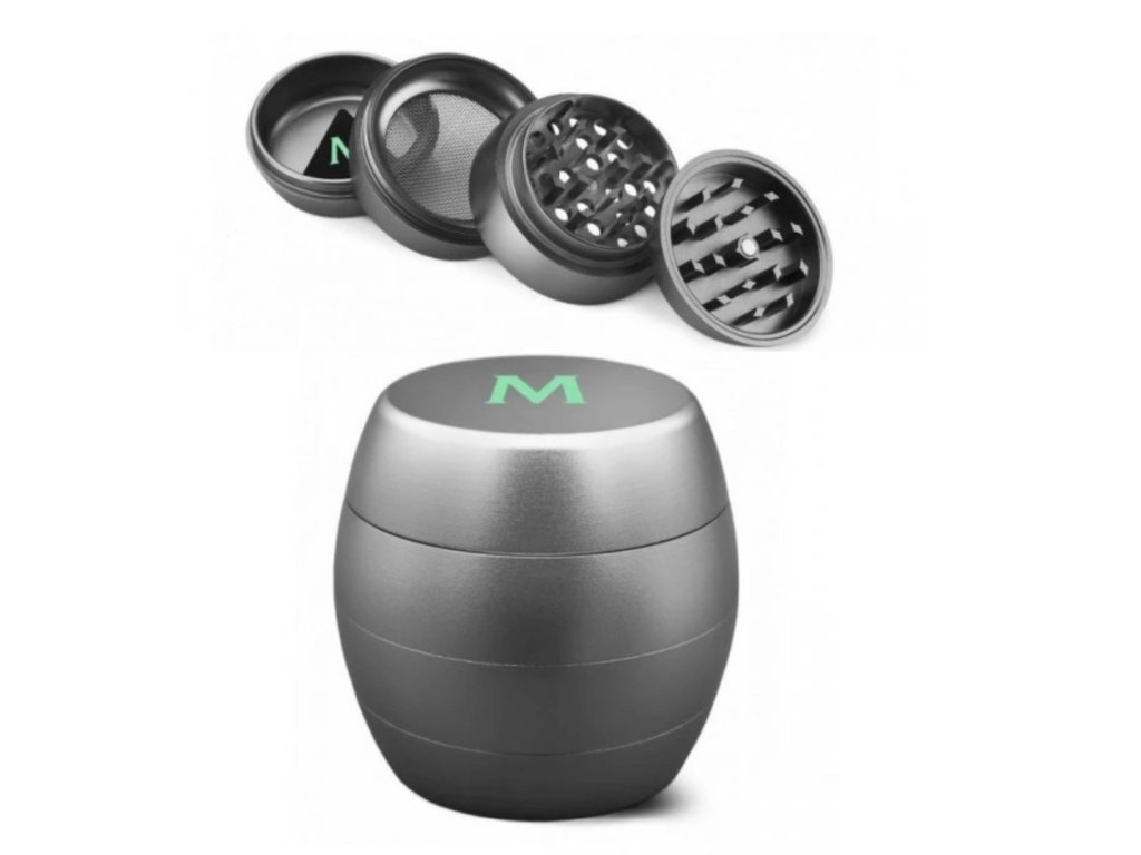 Prvotřídní stříbrná drtička Mascotte Design na suché bylinky se skládá ze čtyř částí a má průměr pouze 4 cm.