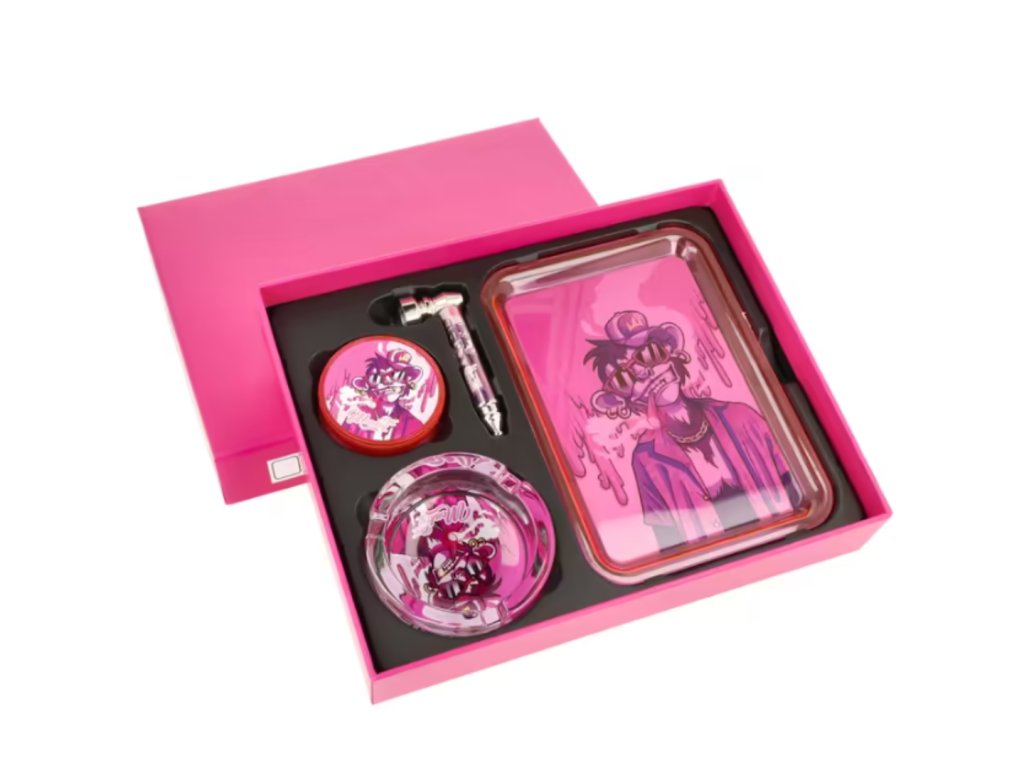 Kuřácká dárková sada Monkey King s drtičkou, šlukovkou a dalšími kuřáckými potřebami. V dárkovém setu nejdete vše, co se může kuřákovi hodit. Obsahem sady v zeleném tónu je dvoudílný plastový drtič, rozkládací kovová šlukovka se sítkem, skleněný popelník a plastový tácek - podložka pro balení cigaret. Praktický kuřácký set vhodný jako dárek pro vaše přátelé. Sada je dodávaná v dárkové krabici.