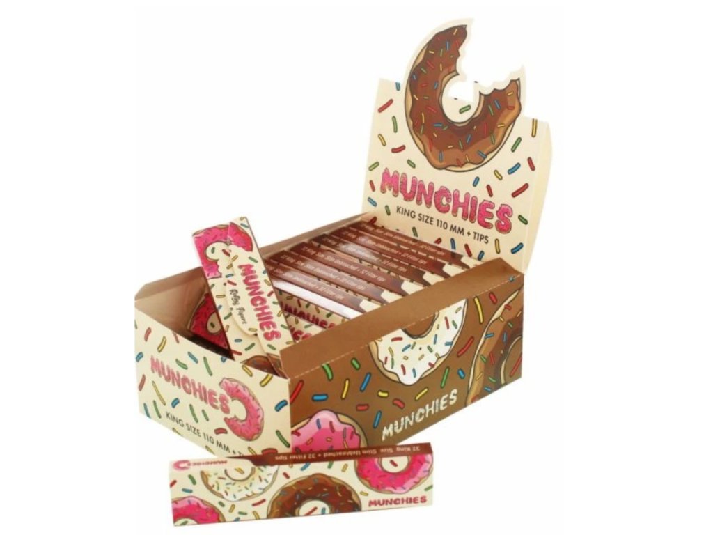 Originální cigaretové papírky Munchies ve velikosti king size o délce 110 mm v balení společně s trhacími filtry. Cigaretové papírky z edice Munchies od španělské značky Monkey King. V tomto zvýhodněném setu najdete 32 kusů jednotlivých papírku ve verzi king size a 32 kusů na jedné straně perforovaných trhacích filtrů. Tyto papírky byly vyrobeny bez použití chlóru, zaručují pomalé hoření jsou extra tenké a jsou vyrobeny z přírodní gumy.