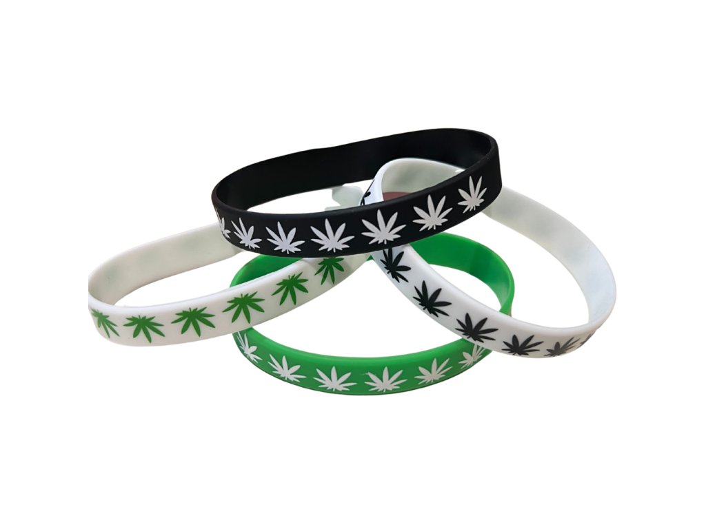 Stylový silikonový náramek pro všechny, kdo chtějí vyjádřit svůj vztah k cannabis kultuře. Dostupný v černé, bílé a zelené barvě, vždy s opakujícím se motivem listu konopí po celém obvodu.