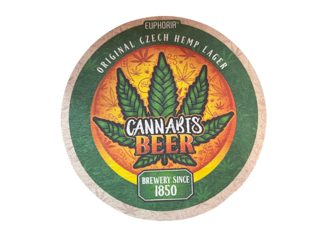 Stylový kulatý podtácek s motivem piva Cannabis Beer od značky Euphoria. Design kombinuje výrazné barvy zelené, oranžové a žluté s ilustrací konopného listu a nápisem „Original Czech Hemp Lager“. Ideální jako praktický doplněk pro milovníky piva, sběratele nebo fanoušky netradičního designu.