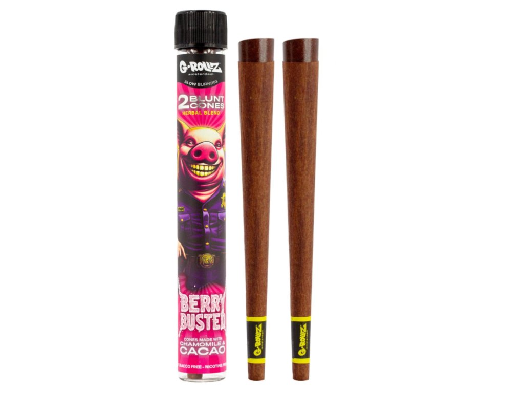 Dopřej si pořádnou chuťovou jízdu s Blunty G-Rollz 'Berry Busted'! Tyto předtočené konopné blunty přináší svěží kombinaci yerba maté, heřmánku a kakaa, napuštěnou terpeny pro intenzivní ovocný zážitek bez tabáku a bez nikotinu.