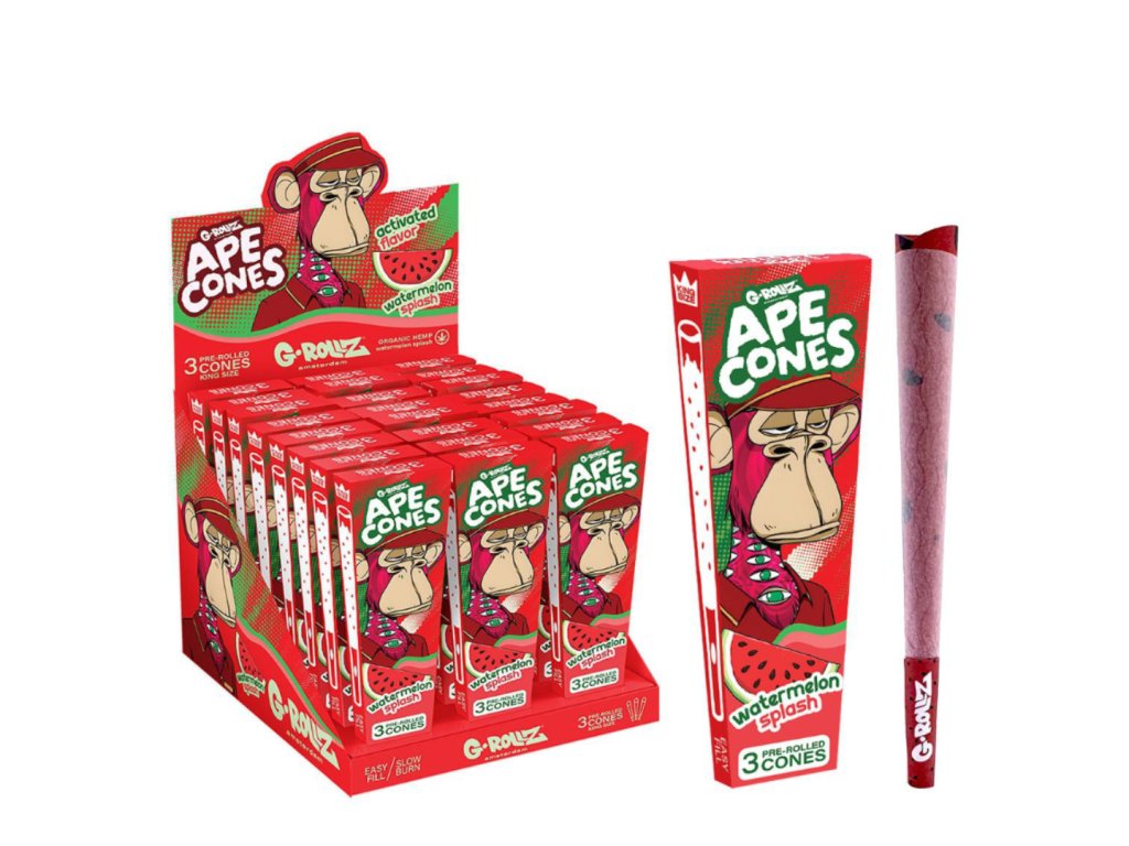 Vychutnejte si osvěžující zážitek s G-Rollz Ape Cones "Watermelon Splash". Tyto předbalené blunty napuštěné příchutí sladkého melounu vám přinesou tropickou explozi chuti v každém tahu. S tímto osvěžujícím zážitkem se budete cítit jako na letní dovolené, ať už jste kdekoli. Stačí otevřít balení a užívat si čisté potěšení z kouření.