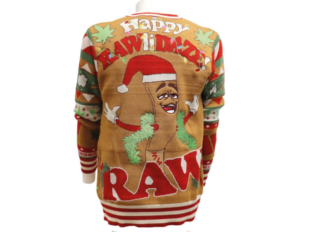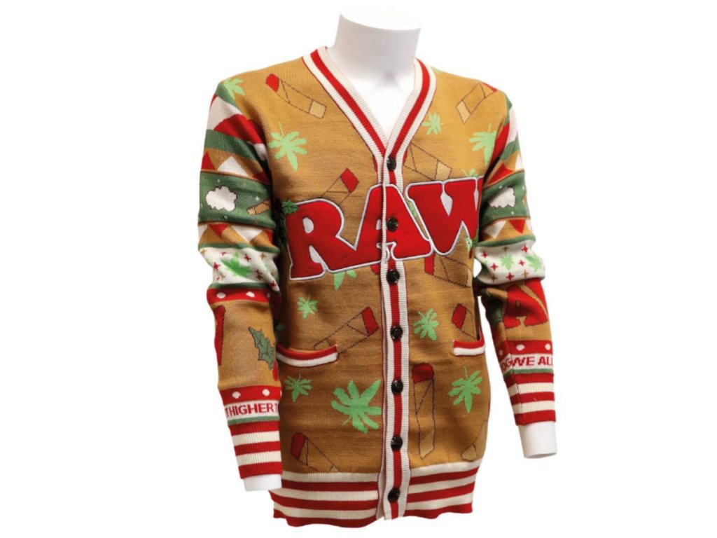 Tento RAW cardigan kombinuje vánoční atmosféru s typickým RAW humorem. Na zadní straně najdeš tančící RAW joint v santa čepici, na přední straně výrazné logo RAW. Materiál je příjemný, hřejivý a vhodný na celodenní nošení.