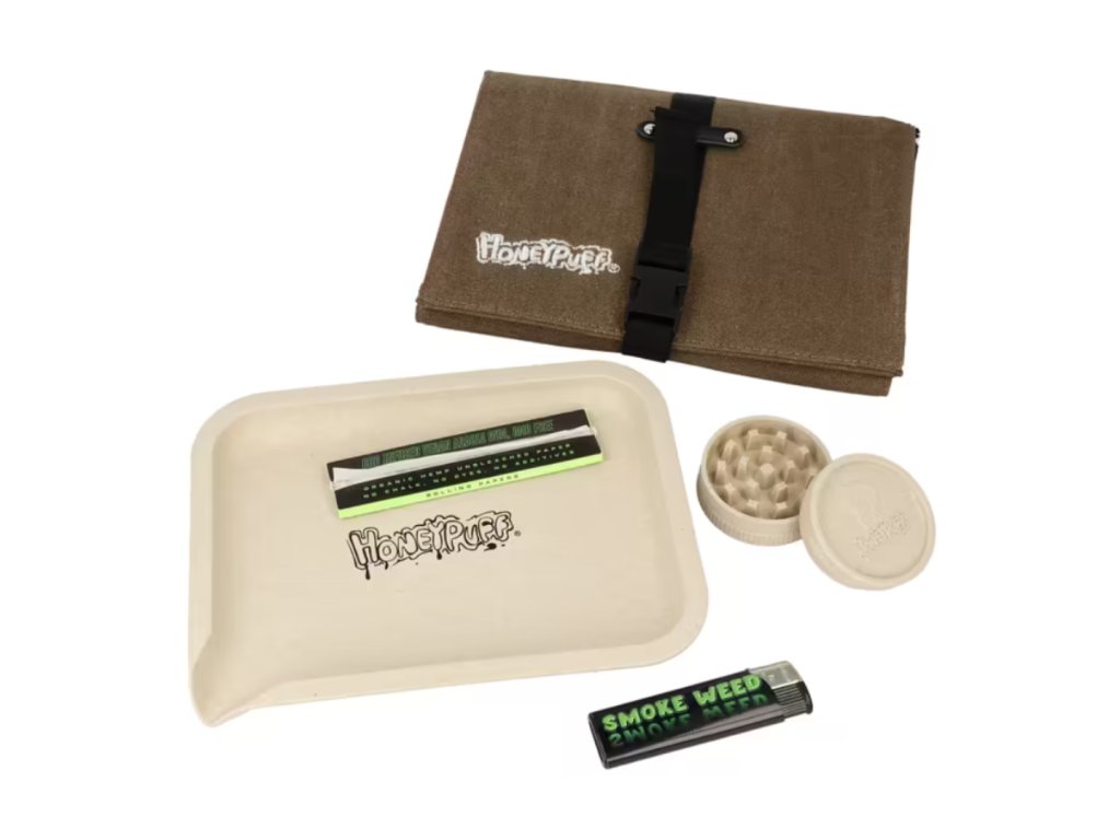 Cestovní balicí sada Honeypuff Hemp béžová s táckem pro balení cigaret, drtičem, zapalovačem a cigaretovými papírky. Všechny kuřácké potřeby k ubalení cigarety máte pěkně pohromadě nejen doma, ale i na cestách. V kuřácké sadě Honeypuff najdete plastovou podložku pro balení, plastový dvoudílný drtič na byliny, cigaretové papírky a plynový zapalovač. Vše je uschované a pevně přichycené v uzavíracím pouzdru z odolné látky. Praktický set je dodávaný v obalu z folie.
