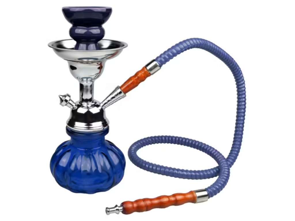 Vodní dýmka Sinai. Malá vodní dýmka vysoká 25 cm má jeden šlauch. Barva dýmky modrá. Vodní dýmka je dodávána s příslušenstvím.