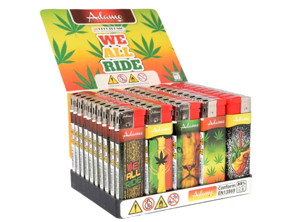 Plynový zapalovač Adamo Piezo Reggae Labels, Crazy Weed. U zapalovače lze měnit výšku plamene, zapalovač není plnící.
